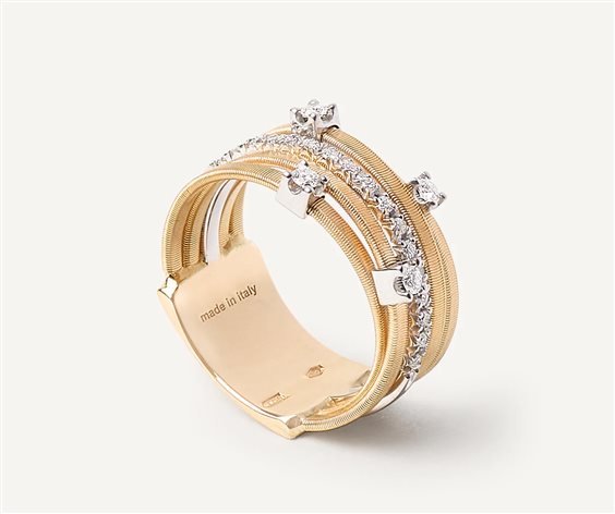 Questo sofisticato anello, in oro giallo 18kt, monta cinque fili di spirale piatta, realizzata grazie all’esclusiva lavorazione artigianale del coil, che si intrecciano tra loro. Impreziosito da una pioggia di diamanti taglio brillante, è un gioiello prêt-à-porter dall'eleganza senza tempo. AG270_B2_YW_M5