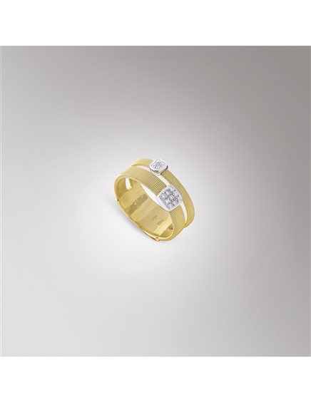 Anello in oro giallo 18 carati realizzato a mano con la tecnica della Corda di chitarra. Questo gioiello monta 0,10 Carati di Diamanti taglio Brillante.