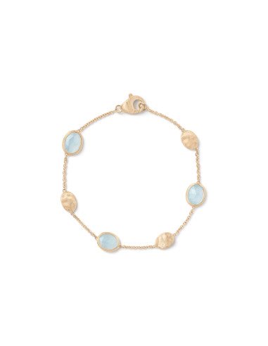 Elegante e senza tempo, questo bracciale in oro giallo 18kt alterna a una sottile catena degli elementi ovali dalla superficie irregolare, finemente incisi a mano con l'antica tecnica del bulino millerighe, e delle selezionatissime acquemarine milky.