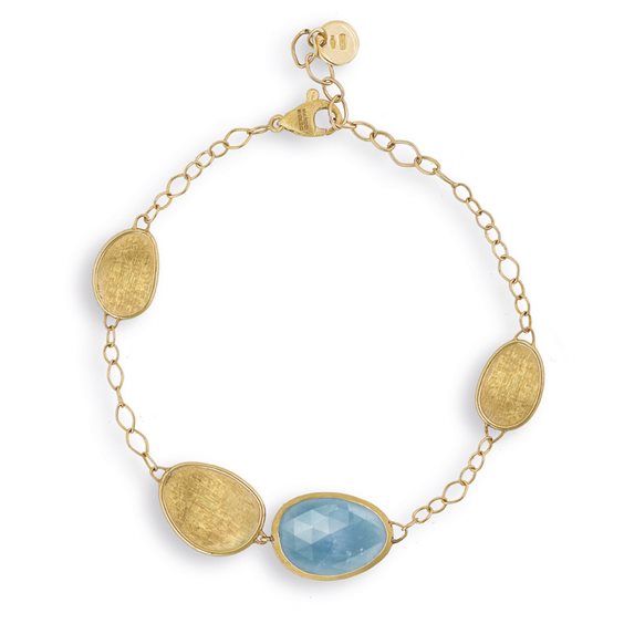 Bracciale con catena irregolare e Acquamarina, Lunaria. Elegante bracciale con catena irregolare in oro giallo 18kt, inciso a mano con l’antica tecnica del Bulino Millerighe e impreziosito da una pietra di Acquamarina Milky.