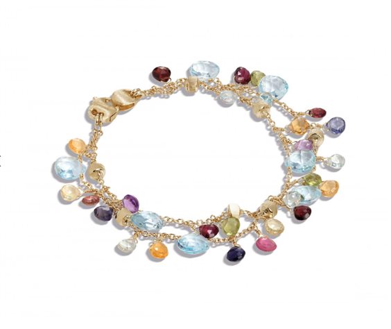 Il vivace mix di colori caratterizza questo bellissimo bracciale multifilo. Le gemme di colore sono caratterizzate dal tipico taglio a cuore e il Topazio Sky spicca per eleganza e purezza. Le pepite in oro giallo 18kt sono incise a mano con l'antica tecnica del Bulino Millerighe.