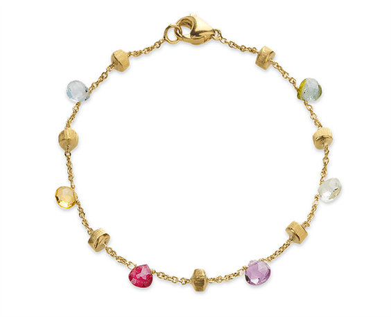 Gioiello in oro giallo 18k inciso a mano con l'antica tecnica del Bulino. Questo gioiello monta una selezione di pietre multicolori taglio tabeez. Il luccicante quarzo rosa e bianco completa una gamma infinitamente delicata di gemme blu acqua e verdi. Un grazioso assortimento di catene in oro giallo 18 carati, minuscole perline dorate incise a mano e gemme colorate unite per creare un'altra preziosa collezione Marco Bicego.