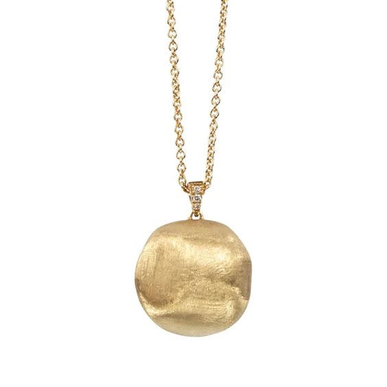 Una lunga catena in oro giallo 18kt, caratterizzata da un pendente sferico dalla superficie irregolare. Questa collana è finemente incisa a mano con l’antica tecnica del Bulino Millerighe e impreziosita da una contromaglia di Diamanti taglio brillante.