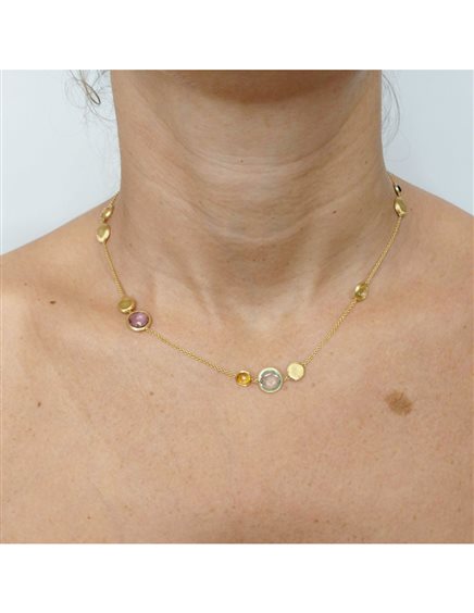 Questo girocollo è caratterizzato da una selezione di gemme multicolore, montate su una finissima catena e alternate a monete d'oro giallo 18kt, incise a mano con l'antica tecnica del Bulino Millerighe.