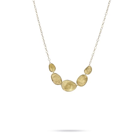 Un collier leggero con catena irregolare e degradé di foglie in oro giallo 18kt, finemente incise a mano con l’antica tecnica del bulino millerighe, per un effetto di straordinaria lucentezza e setosità al tatto.