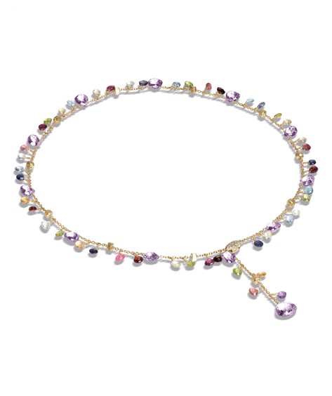 Dal look fresco e sofisticato, questo cravattino alterna selezionatissime Ametiste dal taglio a cuore, a un mix di gemme multicolore e a piccole pepite in oro giallo 18kt, incise a mano con l'antica tecnica del Bulino Millerighe. La chiusura a molletta in Pavé di Diamanti taglio brillante permette di modificarne la lunghezza a proprio piacimento, e indossarla in svariate combinazioni. Lunghezza: 44 cm Caratura totale Diamante bianco: 0,1 ct. Mix fancy di Topazio Sky, Ametista, Iolite, Lemon Citrine, Quarzo giallo, Quarzo rosa, Peridoto, Rodolite, Tormalina rosa e Tormalina verde, taglio a cuore sfaccettato.