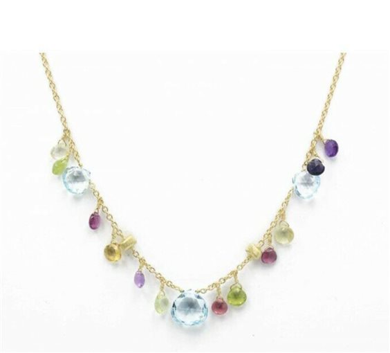 Questo girocollo è un susseguirsi di gemme selezionate. Ioliti e Topazi azzurri, dal taglio a cuore, intervallate da piccole pepite d'oro giallo 18kt, incise a mano con la tecnica del bulino.