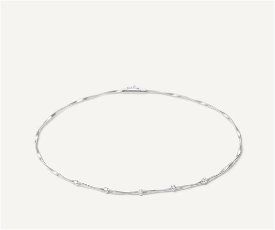 Girocollo con Diamanti, modello Couture, Marrakech. Un filo in Spirale Ritorta, essenziale e di grande eleganza, impreziosito da un degradé di Diamanti taglio brillante. Questa collana girocollo, in oro bianco 18kt, è caratterizzata dallo stile senza tempo e dalla brillantezza unica. Lunghezza: 41 cm; Oro bianco; Caratura totale diamanti: 0,25 ct