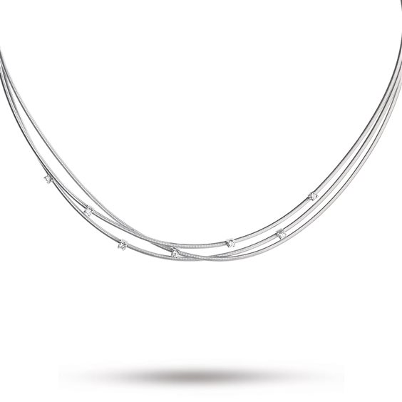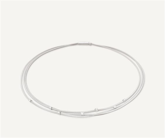 GIROCOLLO IN ORO BIANCO 18CT DI MARCO BICEGO, CARATTERIZZATO DALL'INTRECCIO DI TRE FILI D'ORO BIANCO CON INSERTI DI BRILLANTI. IL COLLIER NON E' RIGIDO, MA SI ADATTA SUL COLLO DI CHI LO INDOSSA SEGUENDONE I LINEAMENTI.