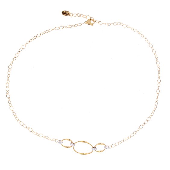 Un delicato girocollo in oro giallo 18kt, caratterizzato da tre ovali in fili di spirale ritorta, realizzata grazie all’esclusiva lavorazione artigianale del coil, legati tra loro da eleganti pavé di diamanti taglio brillante. La catena regolabile lo rende versatile e perfetto per ogni vestibilità.