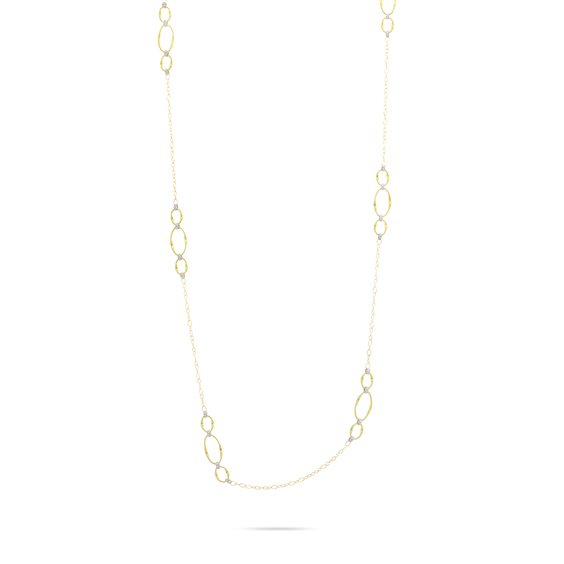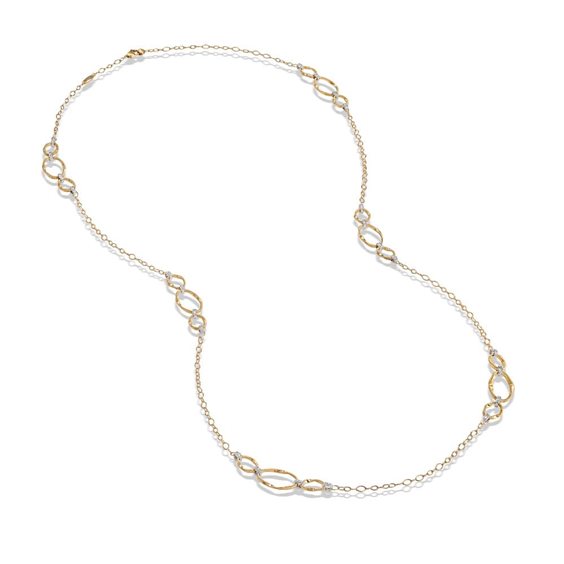 Collana lunga con elementi Ovali e Diamanti, Marrakech Onde. Leggera ed elegante, questa collana lunga in oro giallo 18kt, è caratterizzata da station di elementi ovali in Spirale Ritorta, uniti tra loro da raffinati Pavé di Diamante taglio brillante.