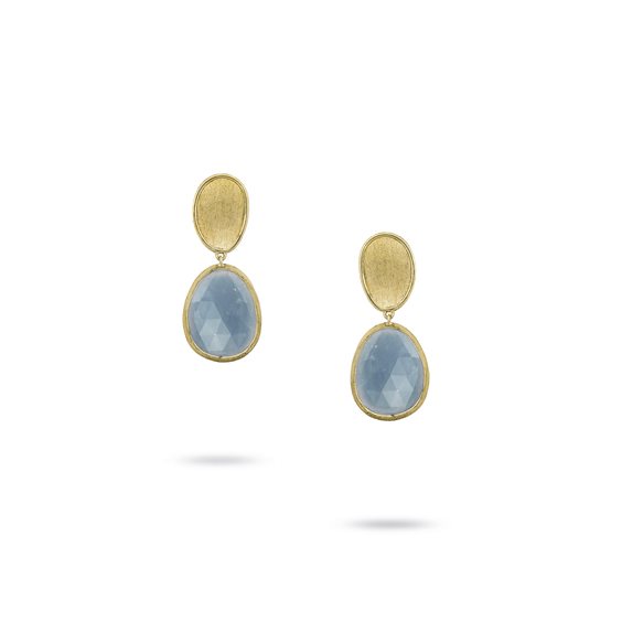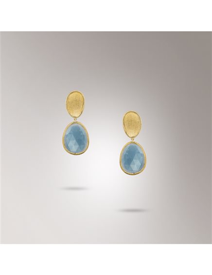 Orrecchino Chandelier con Acquamarina modello Piccolo, Lunaria DESCRIZIONE Versione piccola dell' orecchino Chandelier in Oro giallo giallo 18kt, finemente inciso a mano, con l'antica tecnica del Bulino Millerighe. Questo gioiello è impreziosito da una selezione di Acuqamarina Mikly, dall'azzurro intenso e caratterizzata da bellissime inclusioni naturali. DETTAGLI Lunghezza: 3 cm Acquamarina Milky sfaccettata 15,5x12,5 mm Dalle forme ispirate alla Natura, la Marco Bicego® Lunaria Collection, vanta un design contemporaneo e profili organici che emulano le fragili foglie della pianta balcanica dalla quale prende il nome. La superficie irregolare, incisa a mano dai nostri Maestri Artigiani grazie all’antica tecnica del Bulino Millerighe, è contraddistinta da un tocco satinato unico e da una lucentezza eccezionale.