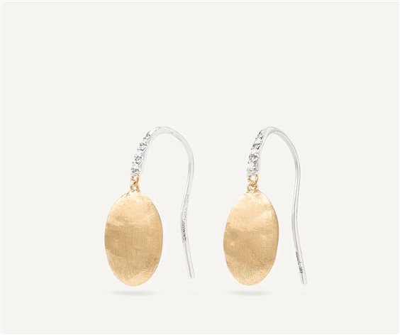 Un orecchino in oro giallo 18kt, dall’eleganza discreta e senza tempo. Un amo di Pavé di Diamanti taglio brillante impreziosisce un elemento ovale, dalla superficie irregolare, incisa a mano con l’antica tecnica del Bulino Millerighe.