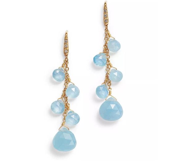 Quest’elegante orecchino pendente in oro giallo 18 carati è impreziosito da un amo in diamanti taglio brillante e da una cascata di acquemarine milky dal caratteristico taglio a cuore, che arricchiscono il gioiello con sfumature delicate.