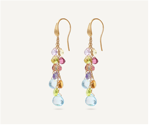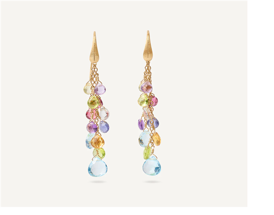 Orecchino multifilo con Amo, Paradise. Una cascata di gemme multicolore dal taglio a cuore e dalle tonalità sgargianti contraddistingue questo bellissimo orecchino. L’amo in oro giallo 18kt è inciso a mano con l’antica tecnica del Bulino Millerighe.