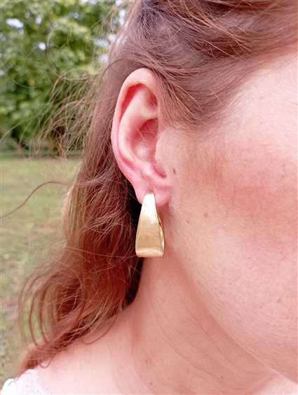 Un orecchino a Hoop in oro giallo 18kt, finemente inciso a mano con l'antica tecnica del Bulino Millerighe. I profili irregolari, che incorniciano il viso, creano un effetto di straordinaria eleganza e luminosità.