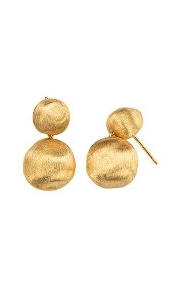 Orecchini in oro giallo 18 Carati inciso a mano con l’antica tecnica del Bulino. profilo sinuoso delle dune africane rivive in questi gioielli composti da coppie di boules in oro giallo inciso a mano. La naturale irregolarità della superficie ha il fascino caldo degli orecchini etnici, il design raffinato ed elegante è il tratto distintivo dell'arte orafa italiana di Marco Bicego.