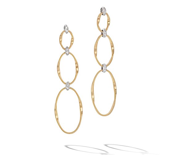 Un orecchino classico ed elegante. Questo gioiello in Oro giallo 18kt, monta un degradé di ovali in Spirale Ritorta, impreziositi da elementi in Pavé di Diamanti taglio brillante.