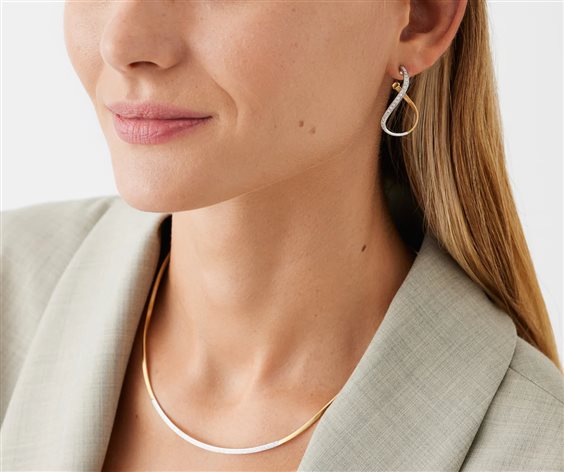 Eleganti e raffinati, questi orecchini in oro giallo 18 carati sono caratterizzati da un filo ritorto in un cerchio irregolare a forma di infinito e ulteriormente impreziositi da un pavé di diamanti. L’esclusiva lavorazione artigianale del coil conferisce al gioiello un'impareggiabile luminosità.