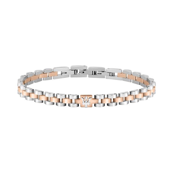 Bracciale da uomo in acciaio inox color argento e oro rosa. Lunghezza totale di 21 cm, regolabile grazie alla possibilità di rimuovere una maglia alla chiusura