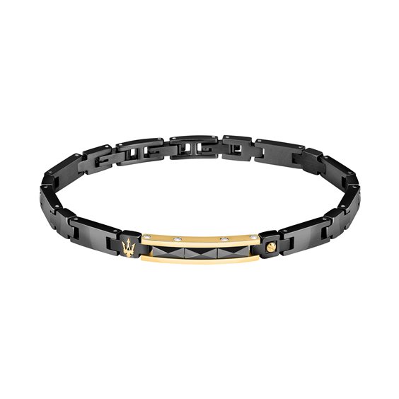 Braccialetto da uomo realizzato in acciaio anallergico con trattamento ip nero. Centrale con finitura dorata, logo laterale e inserti in ceramica nera. Misura regolabile da 18,5 cm a 21,5 cm; chiusura con maglie rimovibili.
