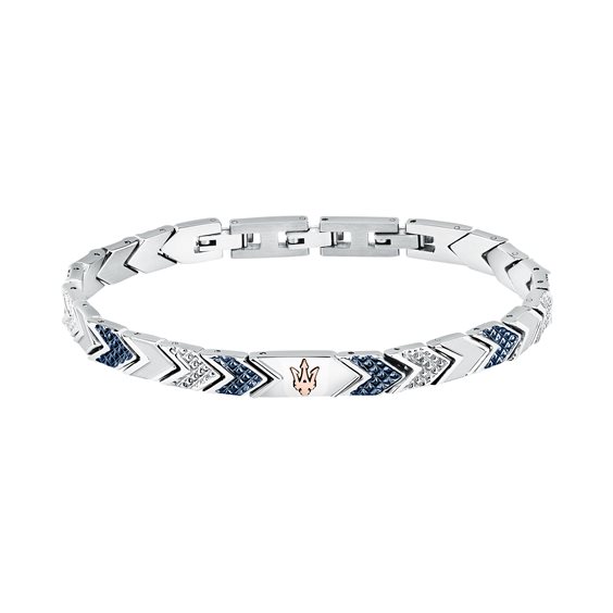 Braccialetto da uomo realizzato in acciaio anallergico con finitura lucida. Centrale con elementi blu e logo rose gold. Misura regolabile da 18 cm a 21,5 cm; chiusura con maglie rimovibili.