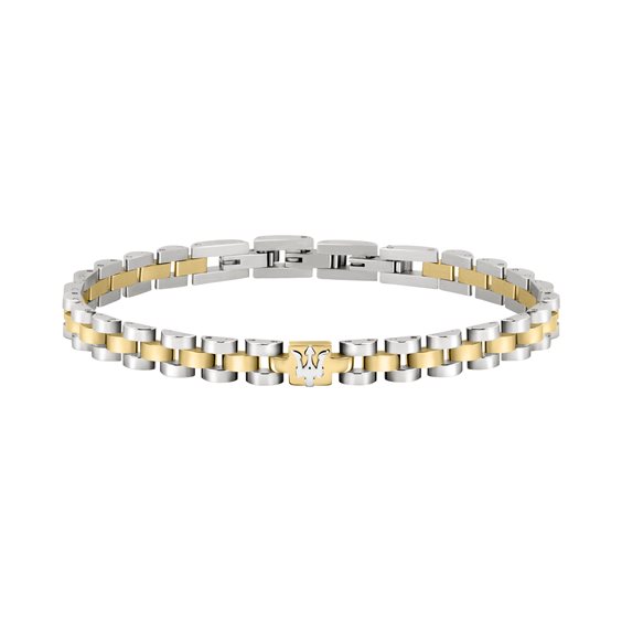 Braccialetto da uomo Maserati realizzato interamente in acciaio anallergico silver e oro. Centrale con gold con logo maserati color argento. Ha lunghezza totale di 21 cm; possibilità di rimuovere alcune maglie alla chiusura.