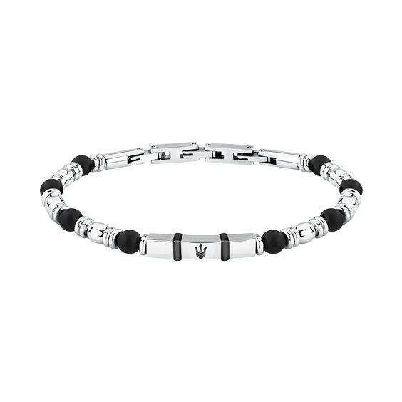 Braccialetto da uomo realizzato in acciaio anallergico e sfere in onice nera. Elemento centrale con logo nero. Misura regolabile; chiusura con maglie rimovibili.