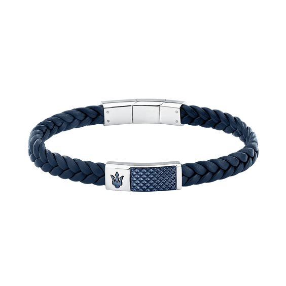 Bracciale uomo Maserati della collezione Recycled Leather realizzato in pelle color blu con l'elemento centrale in acciaio color silver con Tridente. Misura regolabile, lunghezza totale 20 cm. Chiusura a calamita.