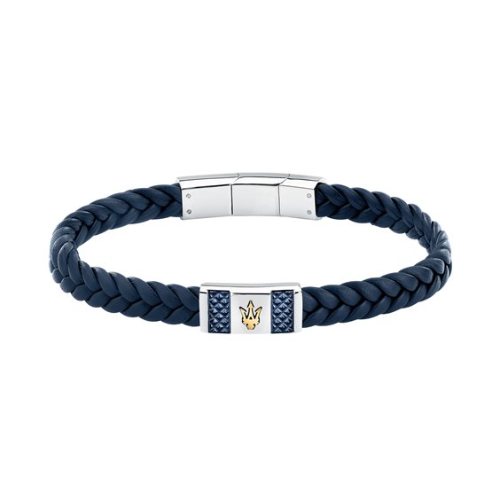 Bracciale in pelle della collezione Maserati da uomo. Colore: blu, argento e oro. Il gioiello è realizzato in pelle riciclata intrecciata di colore blu e decorato con un elemento in acciaio inossidabile 316L color argento che presenta un dettaglio con trattamento pvd oro. La chiusura è a gioielleria. I gioielli firmati Maserati racchiudono in sé la forma e la perfezione tecnica che contraddistingue da sempre la famosissima casa automobilistica Modenese.