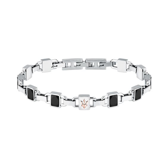 Braccialetto da uomo realizzato in acciaio anallergico. Centrale con logo placcato oro rosa e inserti in ceramica nera. Misura regolabile; chiusura con maglie rimovibili.