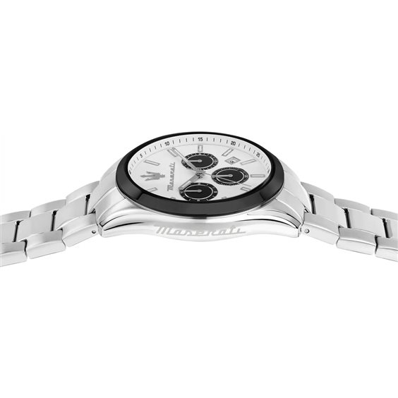 Orologio da uomo multifunzione con movimento al quarzo VD33. Cassa in acciaio inox dal diametro di 43 mm. Lunetta con finitura nera. Quadrante analogico bianco con contatori neri , logo a ore 12 e datario tra le ore 4 e 5. Cinturino in acciaio anallergico; chiusura deployante con pulsanti. Resistente all'acqua fino a 50 metri di profondità.