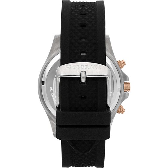 Orologio cronografo da uomo di Maserati della collezione Sfida. Modello in acciaio, silicone. Orologio con cassa in acciaio satinato della dimensione di 44mm. Bracciale in silicone di colore nero con chiusura fibbia ardiglione. Orologio con vetro minerale. Funzioni: cronografo, la resistenza all'acqua è di 10 atm.