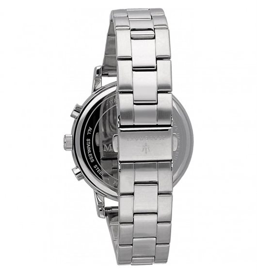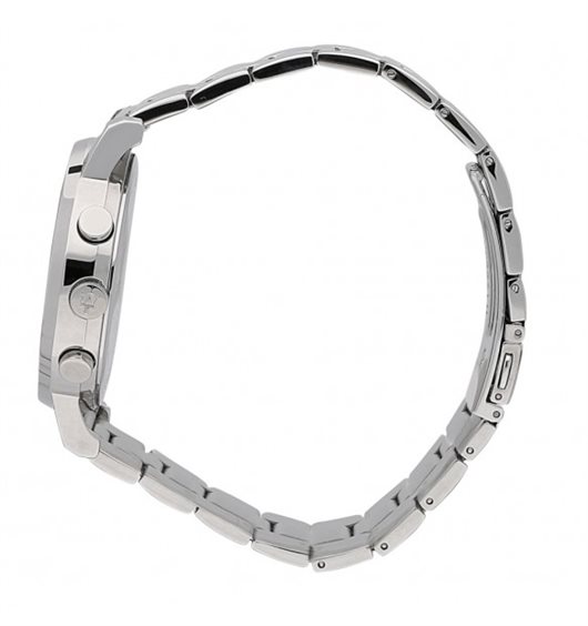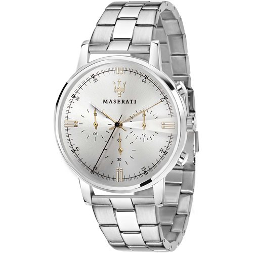Orologio da uomo con movimento al quarzo e funzione di cronografo. Cassa in acciaio inox dal diametro di 42 mm. Quadrante analogico silver con logo ore 12 dorato. Cinturino in acciaio anallergico; chiusura deployante con pulsanti. Resistente all'acqua fino a 50 metri di profondità.
