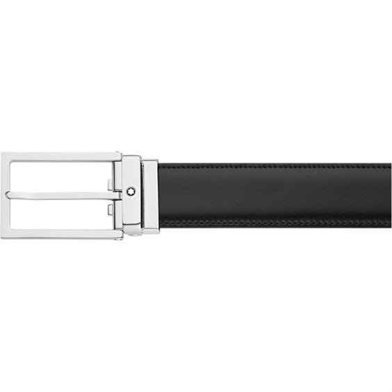 Fibbia ad ardiglione squadrata sottile finitura palladio lucido con emblema Montblanc.Cinghia in pelle reversibile nera e marrone auto-regolabile, 3 cm x 120 cm. Ident : 113273 Materiale: Ottone Chiusura: Nuovo meccanismo facile da aprire per regolare la lunghezza della cinghia Materiale del cinturino: Cinghia in pelle di vitello reversibile nera/marrone, concia al cromo Dimensioni del cinturino: 120 x 3 cm