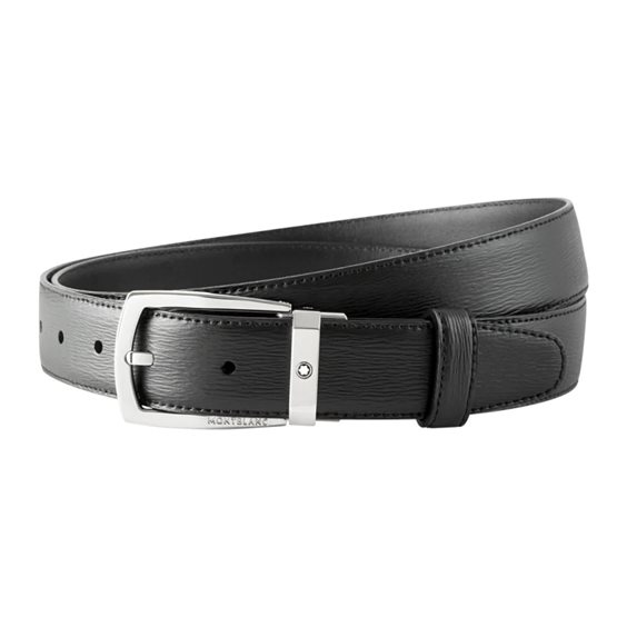 Fibbia ad ardiglione trapezoidale in acciaio pregiato lucido e PVD finitura rutenio. Cinghia in vacchetta nera auto-regolabile, 3 cm x 120 cm con esclusiva stampa raffinata Montblanc coordinata con la linea di pelletteria 4810 Westside. Con la sua nuova fibbia finitura canna di fucile, è la cintura perfetta per un look elegante.