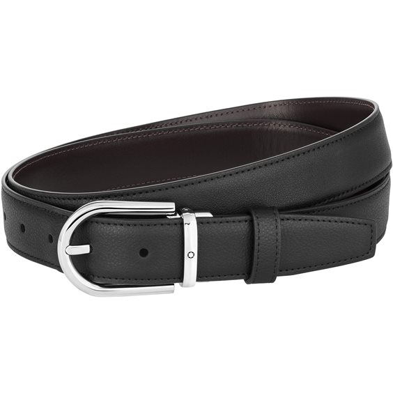 Cintura con fibbia ad ardiglione a ferro di cavallo finitura palladio lucido Fibbia ad ardiglione a ferro di cavallo finitura palladio lucido. Cinghia auto-regolabile, 3 cm x 120 cm, reversibile liscia marrone da un lato e granulata nera dall’altro. Raffinata e discreta, adatta a qualsiasi look.