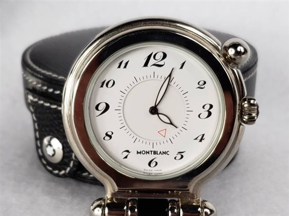 Orologio da scrivania/Viaggio , appartiene alla famosa collezione Timewalker della Montblanc. Con cassa in acciaio inossidabile e pratica stand richiudibile, offre funzioni di allarme ottime per avere una comoda e compatta sveglia portatile. viene fornita con la sua custodia di pelle nera montblanc.