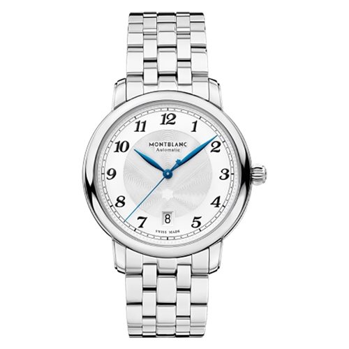 Orologio Montblanc della serie Star Automatic Date con cassa in acciaio, resistenza all'acqua 3ATM, quadrante color argento con lancette con numeri.