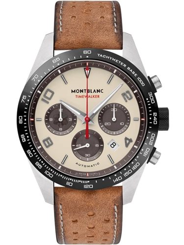 Un orologio da uomo dall'aspetto moderno che offre un quadrante color crema completo di quadranti cronografici a contrasto e lancette luminescenti. La lunetta esterna del tachimetro potrebbe assomigliare a quella di un pneumatico, mentre il cinturino in pelle marrone è forato per prestazioni e stile. Alimentato da un movimento automatico, l'orologio contiene anche un datario funzionante ed è limitato a 1500 pezzi.
