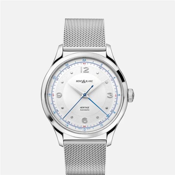 Ispirata agli storici orologi da polso Minerva degli anni ‘40 e ‘50, la linea Heritage unisce l'eleganza dell'arte orologiera del passato alla tecnologia e agli audaci codici di design moderni. Il Montblanc Heritage GMT presenta una cassa in acciaio pregiato interamente lucidato di 40 mm con anse ricurve e goffratura "Manufacture Minerva" sul fondello. Il segnatempo presenta un quadrante bombato bianco-argenté con numeri arabi applicati, indici a puntini e un vetro zaffiro bombato. Il Montblanc Heritage GMT è animato da un calibro automatico dotato di complicazione GMT 24 ore.