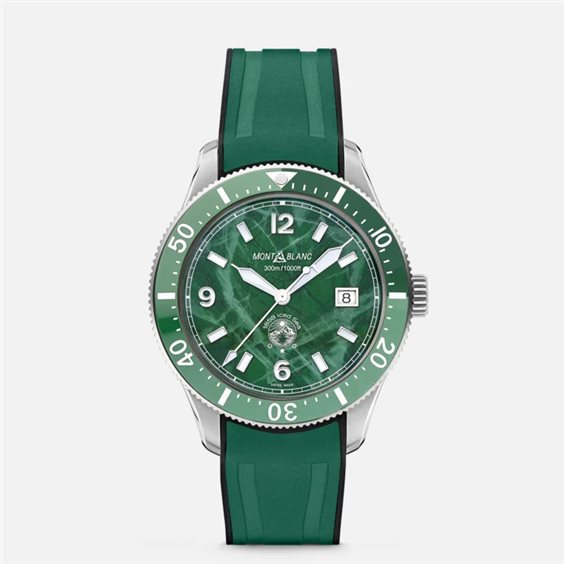 Il primo orologio da immersione sportivo di Montblanc, il Montblanc 1858 Iced Sea Automatic Date, presenta un quadrante con motivo “ghiacciaio” che dà l’impressione di guardare nelle profondità di un ghiacciaio. Questo quadrante verde con motivo “ghiacciaio” è ispirato al Mer de Glace (Mare di Ghiaccio), il ghiacciaio principale del Massiccio del Monte Bianco. La sua texture è stata ottenuta utilizzando una tecnica ancestrale quasi dimenticata chiamata gratté-boisé. Il segnatempo è racchiuso in una cassa in acciaio pregiato da 41 mm e presenta inoltre una lunetta unidirezionale in ceramica bicolore, un fondello inciso e un cinturino in caucciù verde intercambiabile con regolazioni raffinate, per una vestibilità perfetta. Il segnatempo è conforme alla normativa ISO 6425 per gli orologi da immersione ed è impermeabile fino a 300 metri.
