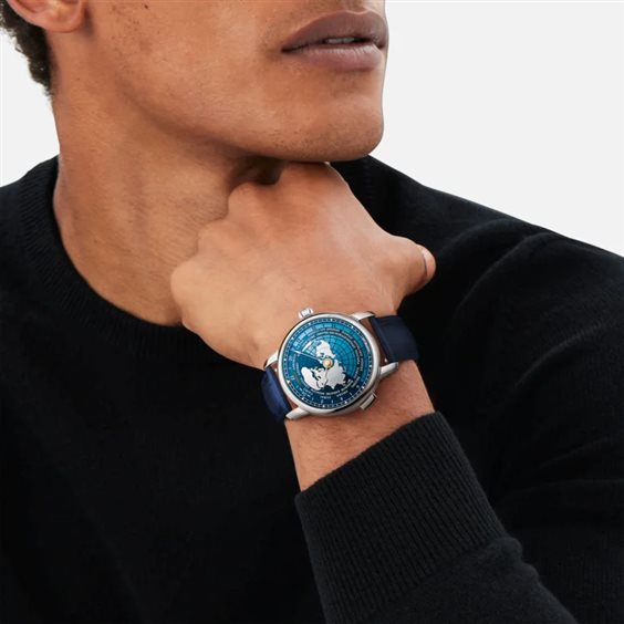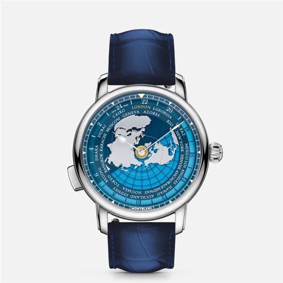 Dietro al Montblanc Star Legacy Orbis Terrarum Limited Edition - 360 esemplari si cela una storia che inizia nel 1872 con Jules Verne e il suo celebre romanza “Il giro del mondo in 80 giorni”. Una storia famosa, all’insegna di intrighi e avventure, che all’epoca era riuscita a stregare l’immaginazione di giovani e non solo. Come Phileas Fogg e Passepartout, il segnatempo è stato pensato per accompagnare gli avventurieri in tutto il mondo con la complicazione di Manifattura ora universale che indica 24 fusi orari a colpo d’occhio. Gli 80 accenti oro ripercorrono il viaggio di Phileas Fogg su un quadrante a più strati che rappresenta la mappa del mondo vista dal polo nord, che ruota seguendo il meccanismo del movimento. Il fondello in titanio presenta un’incisione 3D al laser che apporta colore, profondità e realismo a una rappresentazione del maestoso e fedele elefante Kiouni. Il modello è custodito in una cassa da 43 mm in acciaio pregiato lucido e alimentato dal movimento automatico MB 29,20. Questo segnatempo è inoltre dotato di un cinturino intercambiabile in pelle di vitello blu con stampa alligatore. L’avventura continua sull’interno del cinturino con monete cinesi goffrate e foglie di Boteh scoperte nel viaggio di 80 giorni.