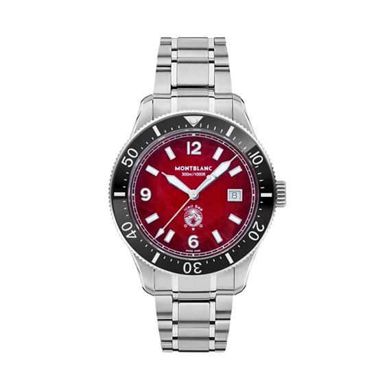 Il Montblanc Iced Sea Automatic Date con motivo “ghiacciaio” bordeaux evoca l’intensa tonalità del sole al tramonto quando si riflette sul ghiacciaio. Il quadrante rosso motivo “ghiacciaio” è ispirato al Mer de Glace (“mare di ghiaccio”), il ghiacciaio principale del massiccio del Monte Bianco. La sua texture è stata ottenuta utilizzando una tecnica ancestrale quasi dimenticata chiamata gratté-boisé. Il segnatempo è dotato di una lunetta unidirezionale in ceramica nera, un’incisione 3D sul fondello e un bracciale intercambiabile in acciaio pregiato con regolazioni raffinate. Il segnatempo è conforme alla norma ISO 6425 relativa alle immersioni subacquee e offre un’impermeabilità fino a 300 metri.