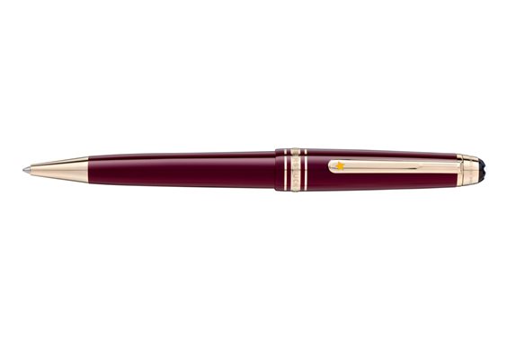 La penna a sfera Meisterstück Le Petit Prince media con resina bordeaux è legata al pianeta: sinonimo di cura, amore, risate e una vita piena di significato. L’anello centrale dei tre anelli finitura platino reca il logo Montblanc, mentre la clip è impreziosita da una stella gialla laccata.