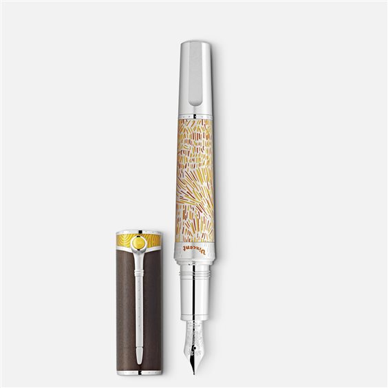 Con Montblanc Masters of Art Homage to Vincent van Gogh Edizione Limitata 4810, Montblanc celebra Vincent Van Gogh, uno dei più celebri pittori del XIX secolo. In particolare, questa edizione rievoca il periodo che l’artista trascorse ad Arles, con dettagli decorativi che richiamano i campi di grano della Provenza, nonché uno dei suoi più celebri dipinti: “Girasoli”. Il numero 1888 inciso sull’anello del corpo - accanto alla firma di Vincent in arancione brillante - ricorda l’anno in cui si trasferì ad Arles. Il corpo è decorato in tonalità di giallo e arancione che rievocano i paesaggi assolati della Francia del Sud, mentre la celebre serie di cinque dipinti di girasoli ha ispirato la versione goffrata sul pennino lavorato a mano in oro massiccio Au 750 finitura rodio. Van Gogh sviluppò uno stile più libero e flessibile e divenne abile sia con il pennello che con la spatola, che utilizzava per stendere tratti di colore più spessi e impetuosi, creando opere con pittura a “impasto”. La sua spatola ha ispirato la clip finitura platino, mentre le sue ampie pennellate sono evocate dalla lacca gialla sulla parte superiore del cappuccio. Inoltre, la sua passione per la pipa, presente in molti dei suoi autoritratti, è catturata in un raffinato dettaglio della clip: la parte superiore ha la forma della testa di una pipa ed è riempita di pregiata resina gialla. In omaggio all’amore di Vincent per le tradizionali xilografie giapponesi, la forma complessiva è ispirata a un coltello da intaglio giapponese, mentre il cappuccio è realizzato in legno. L’edizione è coronata da un emblema Montblanc in pregiata resina gialla.