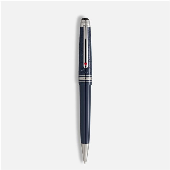 La collezione Meisterstück Around the World in 80 Days si ispira al famoso romanzo di avventura di Jules Verne “Il giro del mondo in 80 giorni”. La penna a sfera LeGrand, decorata con pregiata resina blu scura, racconta l’epico viaggio del Signor Fogg e di Passepartout. Nell’ultima tappa da Yokohama a Londra passando dagli Stati Uniti, il duo attraversa il vasto continente americano in treno. Contempla gli elaborati dettagli: un treno elegantemente inciso al laser sul cappuccio, un motivo catena di sicurezza sul cono, che riproduce un movimento rotante quando Passepartout stacca il treno dalla locomotiva per salvare l’equipaggio attaccato dai Sioux. Il design del cappuccio immortala le valvole della pressione e il fumo della locomotiva, mentre la clip sfoggia l’asso di cuori laccato rosso, simbolo dell’unione di Phileas Fogg e la principessa Auda. Inoltre i semi delle carte rappresentano l’ardita scommessa di Fogg di concludere il viaggio in soli 80 giorni. La parte superiore del cappuccio reca goffrata la cronologia del viaggio: 36 giorni da Yokohoma a Londra, che culminano nel totale di 80 giorni in giro per il mondo.