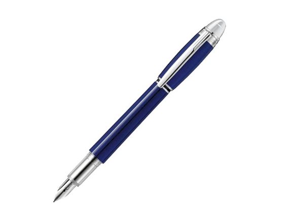 Stilografica con caricamento a cartucce, pennino in oro 14 ct. rodiato, corpo e cappuccio in lacca blu con effetto traslucente su corpo in metallo a lavorazione guilloché, cap top trasparente con stella Montblanc "fluttuante" (caratteristica comune a tutta la linea Starwalker), clip e finiture platinate. Cappuccio con chiusura a vite.