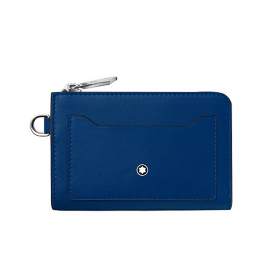 Il portachiavi Meisterstück con quattro aperture per carte di credito è realizzato in una nuova tipologia di pelle blu estremamente lucida. Il nuovo design geometrico lineare ne sottolinea l’essenza funzionale, con più aperture per carte di credito, una tasca con zip e un gancio. Questo astuccio può essere portato comodamente con un laccetto da collo (venduto separatamente) o riposto in tasca.
