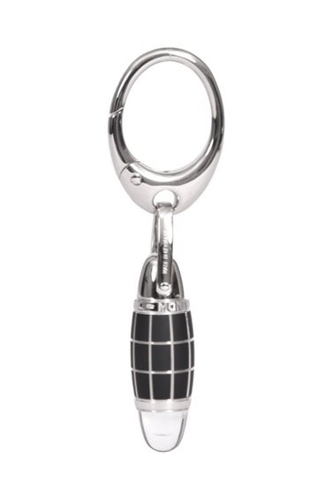 Portachiavi Montblanc starwalker 35861 in acciaio ottonato finitura platino lucido, pendente nero con inserti in caucciu, estremità in resina trasparente con stella marchio Montblanc, anello e moschettone.